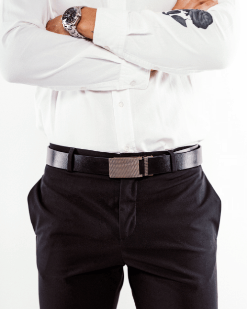 Stecke deinen neuen Gürtel von rechts nach links in deine Hose. Um den Gürtel zu öffnen, drücken Sie die Spitze auf der Unterseite der Schnalle von sich weg.