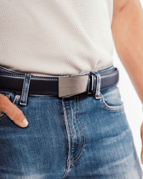 Put your new belt in your pants from right to left. To unlock the belt, push the tip on the underside of the buckle away from yourself.